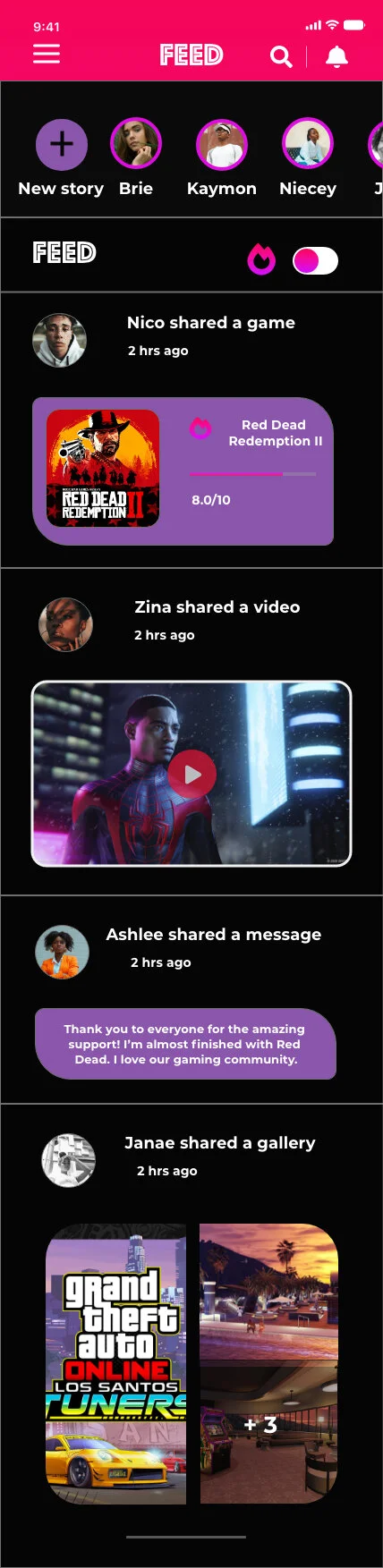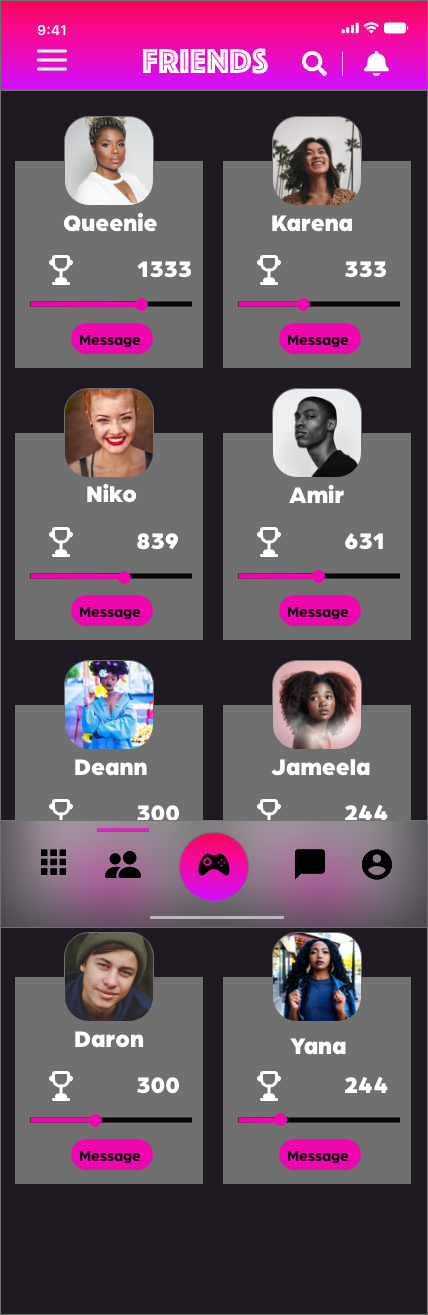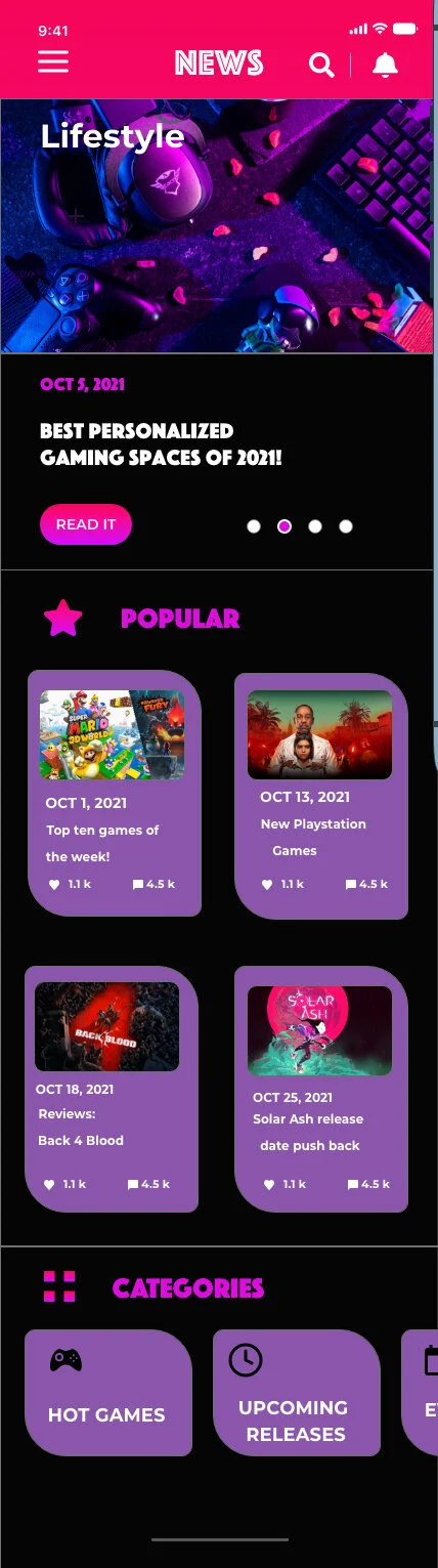 BLACK GIRL GAMER was designed during an Abode XD iOS gaming app challenge. I designed a space that was inclusive for everyone who wanted to join and celebrate Black women gamers. This space is intended to be free of racism, misogyny, and misogynoir. The design was bright and vivid coupled with a dark background like many of the popular video games now. The app is a place to play games, read gaming articles, make friends and purchase games and merch.